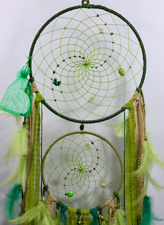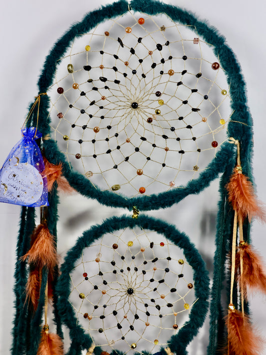 Be enchanted by our handmade dream catcher with a double ring – the perfect size for those seeking a special, spiritual touch in their homes. Each dream catcher is crafted with care and attention, using natural materials and carefully selected gemstones.