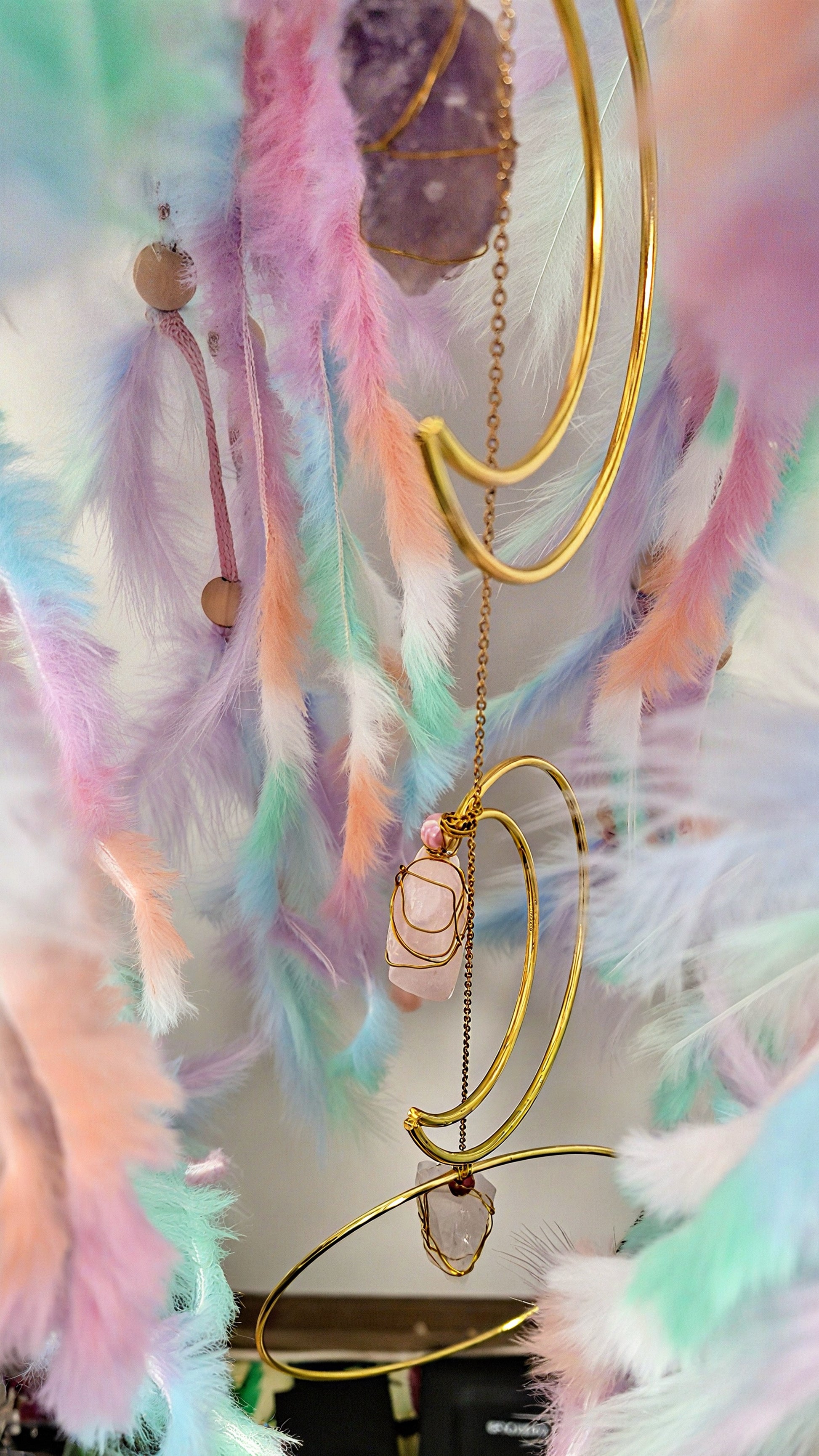 Al onze droomvangers zijn gevuld met echte edelstenen elk afgestemd op de het verhaal die het ontwerp verteld. Dat maakt elke droomvanger uniek, ze zijn handgemaakt van begin tot eind.